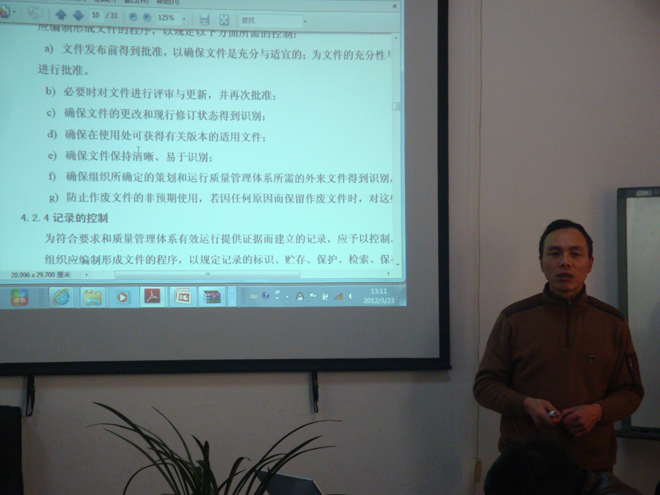 3.23日,公司聘請(qǐng)ISO9000管理體質(zhì)培訓(xùn)講師王兵老師對(duì)全體職員進(jìn)行培訓(xùn)學(xué)習(xí)。王老師以其豐富的現(xiàn)場管理經(jīng)驗(yàn),領(lǐng)導(dǎo)完成多項(xiàng)生產(chǎn)、質(zhì)量技術(shù)改造工程;策劃和推行以過程為導(dǎo)向的質(zhì)量有效控制與現(xiàn)場持續(xù)改善活動(dòng),解決公司產(chǎn)品的關(guān)鍵質(zhì)量問題,大大提高了產(chǎn)品的合格率。王老師在生產(chǎn)管理、質(zhì)量管理培訓(xùn)領(lǐng)域有豐富的授課經(jīng)驗(yàn),講授公開課暨企業(yè)內(nèi)訓(xùn)三百多次。講課主要特點(diǎn)是能針對(duì)不同的企業(yè)特點(diǎn)、學(xué)員層次、結(jié)合企業(yè)的實(shí)際情況采用不同的授課方式和內(nèi)容。