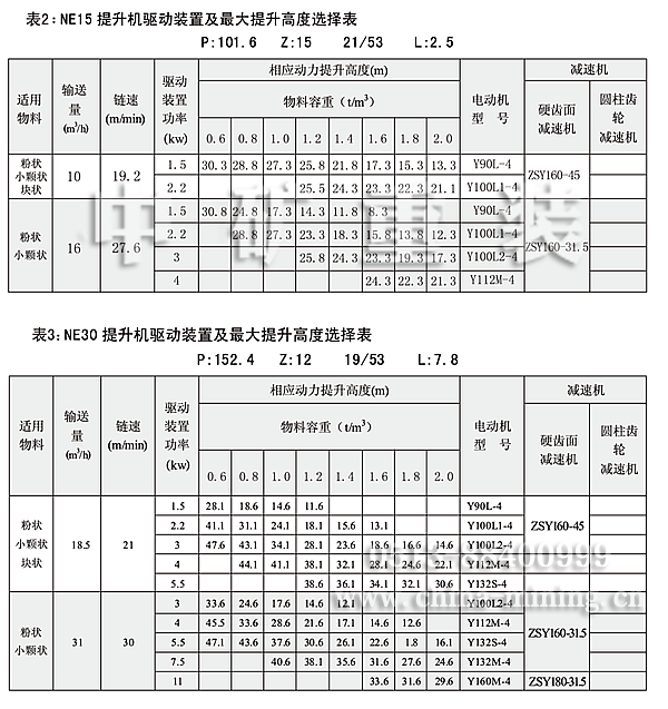 NE15、NE30、NE50、NE100、NE150、NE200、NE300、NE400型提升機(jī)的提升量、提升高度及動(dòng)力配備表見(jiàn)表2-9,選擇NE500、NE600、NE800型提升機(jī)時(shí),請(qǐng)與中礦公司技術(shù)部聯(lián)系,聯(lián)系人:周小姐,聯(lián)系電話(huà):0513-88400999。